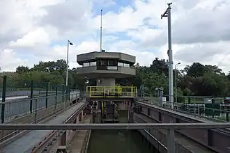 ![]() Unterhaupt der Schleuse Altenrheine mit Schiebetor und Steuerstand | ||
