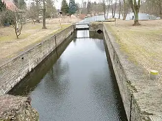 ![]() Blickrichtung Nordosten von der Straßenbrücke Chausseestraße über die Schleusenkammer zum Oberhaupt. | ||