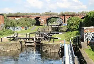 Unter einer Schleusentreppe versteht man eine Schleuse, bei der zur Überwindung einer größeren Fallstufe mehrere Schleusenkammern unmittelbar oder mit kurzen Zwischenhaltungen aufeinander folgen.[1]