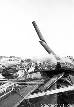 Im September 1984 wurde mit dem Abriss der Gebäude der Hildener Stückfärberei Schlieper & Laag begonnen.[36] Die Sprengung des Fabrikschornsteins erfolgte kurz danach am 13. Dezember 1984 und am 27. Dezember 1984 wurde die großen Halle gesprengt.[37]