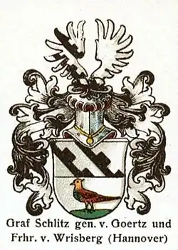 Deren Sohn und Erbe war Ludwig Freiherr von Schlitz genannt von Görtz und von Wrisberg (1745–1806), Kammerherr und Schatzrat des Stifts Hildesheim. Dessen Gattin war Maria Carolina Scriba (1746–1827). Sie war die Tochter des Gebhard Werner (von) Scriba, Oberamtmann zu Rittmarshausen und Herrn auf Ebergötzen, und erhielt 1793 gesondert den Reichsadelsstand, als „Scriba von Löwenfeld“,[5] nachdem ihr Bruder Johann Philipp Ludolph Scriba († 1800) bereits vorher im selben Jahr[6] für die ganze Familie den erblichen Reichsadelsstand erhalten hatte. Deren Söhne Plato, Werner und Moritz von Schlitz genannt von Görtz und von Wrisberg erhielten 1817 vom späteren König Georg IV. als Prinzregenten von Hannover die Anerkennung ihres Grafenstandes.[7][8]