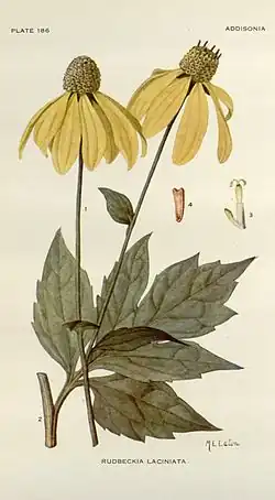 - ↑ a b Rudbeckia laciniata im Germplasm Resources Information Network (GRIN), USDA, ARS, National Genetic Resources Program. National Germplasm Resources Laboratory, Beltsville, Maryland.
