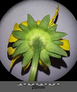 In einem Blütenkörbchen stehen acht bis zwölf Zungenblüten (Strahlenblüten) und 150 bis über 300 Röhrenblüten (Scheibenblüten) zusammen. Die goldgelben Zungenblüten weisen eine Länge von 1,5 bis 5 Zentimetern und eine Breite von 4 bis 14 Millimetern auf und werden später zurückgeschlagen. Die gelben bis gelblich-grünen (olivgrünen) Röhrenblüten weisen eine Länge von 9 bis 30 Millimetern und einen Durchmesser von 10 bis 23 Millimetern auf, mit gelben 3,5 bis 5 Millimeter langen Kronlappen. Die Griffeläste weisen eine Länge von 1 bis 1,5 Millimetern auf.