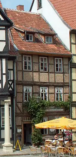 Das dreistöckige Fachwerkhaus entstand etwa um 1740 und gehört zu den barocken Zeugnissen der Quedlinburger Fachwerkarchitektur. Die Schwellen des Fachwerks weisen eine starke Profilierung auf. Die Gefache sind mit Ziegeln ausgemauert und überstrichen.