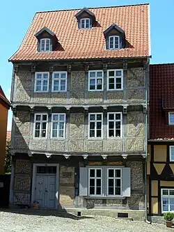 Das dreigeschossige Fachwerkhaus entstand um 1680 mit überkragenden Obergeschossen. Es diente wohl als Haus für die Prediger des Stifts. Die Fassade weist die für die Bauzeit typischen Pyramidenbalkenköpfe auf. An den Schwellen der oberen Stockwerke finden sich Schiffskehlen. Knaggen und Füllhölzer weisen ein Karniesprofil auf. Die Gefache sind mit handgeformten Ziegeln ausgemauert. Sie zeigen die typischen Schmauchspuren des zur Herstellung genutzten Feldbrandofens. Die Fugen sind mit weißem Gipsmörtel verfugt. Der Giebel des Hauses ist unverputzt und zeigt diese historische Ausmauerung der Gefache. Bei dem eingesetzten Holz handelt es sich um Nadelhölzer. Bemerkenswert ist die ungewöhnliche Farbgebung der Fassade mit grauen Holzbalken und der Ausmauerungen mit ocker-gelben Fond sowie grauem und weißem Bandelwerk, welches Motive wie Tuchgehänge, Blattwerk und Zapfen zeigt. Die Malereien werden als Stuckimitationen gewertet. Da schräge Fachwerkbestandteile übermalt wurden, entstanden rechteckige Fassadenfelder. Die Fassadengestaltung geht auf eine Neugestaltung der Fassade in der Zeit des Spätbarock/Rokoko um 1730 zurück. Eine ähnliche Gestaltung ist in Quedlinburg nur an vier anderen Objekten, darunter die Breite Straße 53 und der Stieg 16 bekannt.