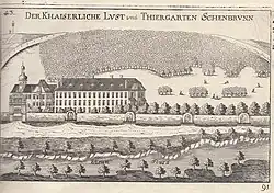 Schloss Schönbrunn geht in seiner heutigen Form auf eine Ende des 17. Jahrhunderts von Kaiser Leopold I. begonnene Anlage zurück, die Erzherzogin Maria Theresia Mitte des 18. Jahrhunderts vollenden ließ. Die ehemalige Sommerresidenz liegt im 13. Wiener Gemeindebezirk Hietzing. Der Name Schönbrunn bezieht sich auf einen Kaiser Matthias zugeschriebenen Ausspruch. Er soll dort im Jahr 1619 auf der Jagd eine artesische Quelle entdeckt und darüber erfreut ausgerufen haben: „Welch’ schöner Brunn!“ An dieser Stelle im Schlosspark befindet sich heute der Schöne Brunnen. Mitte des 17. Jahrhunderts war ein Schlossbau als Residenz für die zweite Ehefrau des Kaisers Ferdinand II., Eleonora Gonzaga, errichtet worden. Diese Anlage wurde bei der Zweiten Wiener Türkenbelagerung 1683 schwer beschädigt. 1687 gab Leopold I. weit vor den Toren der Stadt für seinen Thronfolger Joseph I. einen barocken Neubau von Johann Bernhard Fischer von Erlach in Auftrag, der von 1695 bis 1700[2] ausgeführt wurde.
