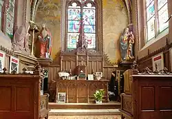 Im Innenraum ist noch einiges von der originalen Innenausstattung aus dem 16. Jahrhundert vorhanden.[12] Der Bodenbelag des Innenraums besteht aus Terrakotta-Fliesen, die das Wappen der Familie Picart dʼÉtelan zeigen,[16] während die Wände mit einer neugotischen Täfelung aus Eichenholz verkleidet sind. Die Kapelle ist dreijochig und besitzt ein bunt bemaltes Kreuzrippengewölbe, dessen Schlusssteine skulptierte Wappendarstellungen tragen. Die Gewölbeflächen sind ebenfalls bunt bemalt und zeigen goldene Fleur-de-Lys auf blauem Grund. Kunsthistorisch besonders wertvoll ist die 1987 aufwändig restaurierte Wandmalerei des 15. Jahrhunderts[12] hinter dem Altar. Sie kam erst nach der Trockenzeit im Jahr 1976 zum Vorschein, als sich an einigen Stellen Schimmel von der Wand löste. Das Fresko zeigt das Jüngste Gericht und die Gregorsmesse. Rechts und links oberhalb des Altars stehen bunt bemalte Skulpturen: rechts die heilige Jungfrau mit dem Kinde, auf der linken Seite Maria Magdalena kniend vor dem wiederauferstandenen Jesus.