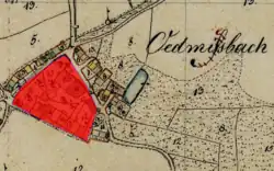 Das Schloss lag in der Ortsmitte von Ödmiesbach, wobei sich das Schlossareal zwischen Zeinrieder und Teunzer Straße erstreckte. Nachdem die Besitzungen in Ödmiesbach 1830 zertrümmert worden waren und der letzte Hofmarksbesitzer verstorben war, verfiel das Schloss und wurde nach und nach abgebrochen. Das Schlossareal ist heute durch mehrere Häuser (Ödmiesbach 1, 3, 4, 6, 8, 12) überbaut. In seiner Nordecke liegt die Dorfkapelle.