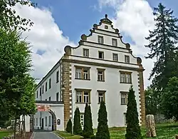 Der von einem Park mit Schlossgarten mit fremdartigen Gehölzen umgebene zweigeschossige Renaissancebau mit spitzem Giebeldach ist ein typischer Einhausbau – Nebengebäude finden sich hier nicht. Im Erdgeschoss ist das Informations- und Tourismuszentrum der Stadt sowie eine Konditorei untergebracht. Im zweiten Geschoss befindet sich das Forstmuseum. Das Schloss ist ein Beispiel für die sächsische Renaissance in Böhmen.[1]