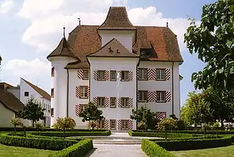 ![]() Schloss Aesch (Ostseite) mit Schlosspark und Springbrunnen (2009) | ||