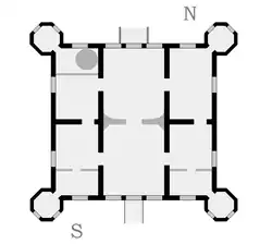 Das Schloss ist, dem äußeren Aufbau folgend, auch im Inneren dreigeteilt. Der ursprüngliche Grundriss zieht sich durch alle vier Geschosse und ähnelte dem von Glücksburg, wenn auch in einer reduzierten Variante. Wie dort beherbergte das mittlere Haus durch den gesamten Bau führende Säle, während die seitlichen Häuser durch je eine mittige Wand in zwei Hälften geteilt wurden.[35] Im westlichen Langhaus befand sich ursprünglich eine innen liegende Wendeltreppe,[36] die später jedoch entfernt wurde. Drei weitere Wendeltreppen gibt es in den Türmen, die wie in Glücksburg anfangs kleine, achteckige Kabinette enthielten.[36]