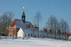 Nördlich und südlich der Kirche befinden sich die sogenannten Gottesbuden. Bei ihnen handelt es sich um zwei längliche, einstöckige Wohnbauten, die den einstigen Kirchhof umrahmen und ursprünglich durch Mauern im Osten und Westen ein abgeschlossenes Areal bildeten. Die Häuser enthielten Wohnungen für bedürftige Angehörige des Gutsbetriebs, Alte und Kranke, für die sich der Gutsherr verantwortlich fühlte, ein Novum in der damaligen Zeit und trotz der bestehenden Fürsorgepflicht der Gutsherren gegenüber ihren Leibeigenen längst nicht auf allen Gütern selbstverständlich.[7] Peter Rantzau verfügte testamentarisch, dass die Armenstiftung auch nach seinem Tode bestehen bleiben sollte und kündigte sogar „Gottes Strafe und alles Unglück hier auf Erden“ denjenigen an, die sich an der Stiftung bereichern oder sie vernachlässigen würden.