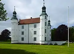 Der Kubus wird von vier schlanken achteckigen Türmen flankiert. Diese Türme waren im ersten Entwurf des Hauses noch nicht vorhanden und sind dem Herrenhaus erst während der Bauphase hinzugefügt worden.[34] Sie besitzen kupfergedeckte Hauben, die einen Kontrast zu den mit roten Ziegeln gedeckten Dächern der Langhäuser bilden. Die Windfahnen der Türme in Form je eines halben Rosses samt Reiter erinnern an den Begründer des Gutsbesitzes, Daniel Rantzau, der in der Schlacht von Varberg zusammen mit seinem Pferd von einer Kanonenkugel getötet worden sein soll.