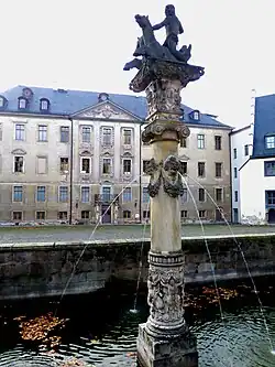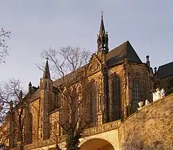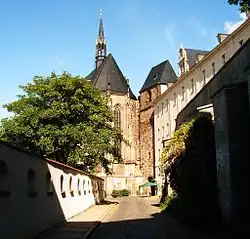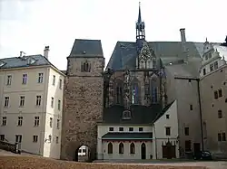 Die Schlosskirche St. Georg wurde von 1404 bis 1414 von den neuen wettinischen Herren im gotischen Stil gebaut. Durch einen Brand im Jahr 1444 stürzte das Kirchengewölbe ein und wurde im spätgotischen Stil als reichgeschmücktes Sterngewölbe mit Maßwerkverzierung wieder aufgebaut. Da sich das Schloss auf einem Felsen erhebt, ist die Kirche auf einem Altan erbaut. Seit 1413 war die Schlosskirche auch Stiftskirche des Georgenstifts, bzw. des Kollegiatstifts St. Georg bis 1533.
