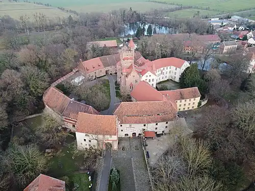 Das Schloss liegt im nördlichen Teil des Dorfes. Nach Norden und Westen erstreckt sich ein Schlosspark. Das Schloss selbst besteht aus einer runden Kernburg mit einem Wohnhaus im Stil der Renaissance, an das ein hoher neogotischer Palas mit eingebautem Bergfried anschließt. Westlich vor der Kernburg liegt ein Wirtschaftshof mit Gebäuden aus der Spätgotik, dem Barock und dem Historismus. Die Gebäude stehen dabei auf der mittelalterlichen Ringmauer.