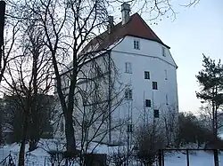 „Ehemaliges Wasserschloss Asch, ungegliederter dreigeschossiger Bau mit Halbwalmdach, nach 1541.“