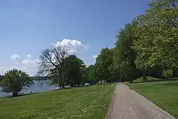 Der die Anlage umgebende Schlosspark ist aus einem Barockgarten hervorgegangen. Die Fläche vor dem Schloss war einst durch Broderieparterres und Boskette geschmückt.[31] Der barocke Garten wurde im 19. Jahrhundert in einen Landschaftspark umgeformt. Die ursprüngliche Gestalt ist seitdem nur noch in Grundzügen zu erkennen: insbesondere im nahen Waldbereich haben sich einige Alleen des 18. Jahrhunderts erhalten. Nach dem Auszug der herzoglichen Familie 1848 wurden keine größeren Umgestaltungen mehr vorgenommen.