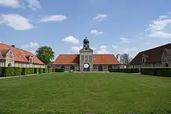 Die barocken Bauten des Wirtschaftshofs bestehen aus unverputztem, lehmfarbigem Backstein. Sie stammen aus den Jahren 1764 bis 1770 und wurden noch vor dem Neubau des Schlosses errichtet.[11] Der mittlere Bau mit dem Torhaus ist als Gegenstück zum Schloss aufwendiger gestaltet als seine seitlichen Pendants. Die Gebäudemitte mit der Tordurchfahrt wird von einem dreiachsigen, mit einem Dachreiter bekrönten Uhrturm betont. Der Dachreiter enthält die Glocken der Schlosskirche. Das Torhaus diente als Pförtnerwohnung und Remise, worauf bis heute vier große Tore verweisen. Im nördlichen Trakt dieses Gebäudes ist das sogenannte Mini-Museum untergebracht, in dem die Geschichte des Schlosses und seiner Bewohner erläutert wird. Das Torhaus wird nördlich und südlich von zwei langgezogenen Wirtschaftsbauten flankiert. Das südliche Gebäude diente ehemals als Marstall, das nördliche als Reithalle, in der auch das Gutskontor und Räume für die Stallknechte untergebracht waren. Hinter der Reithalle befinden sich als weitere Nebengebäude die frühere Schlossküche und das einstige Waschhaus. Die Bauten des Wirtschaftshofs dienen heute vor allem der Verwaltung des Klinikbetriebs.