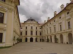 Das U-förmige Schloss verfügt über 115 Zimmer. Sehenswert sind der Saal der Vorfahren und der Rubens-Saal (ohne Werke von Peter Paul Rubens) sowie die Kapelle des Heiligen Geistes. Der ovale Gesellschaftssaal (Historischer Saal) weist eine räumliche und akustische Originalität auf und enthält seltene Fresken des Wiener Malers Joseph Pichler. In diesem Saal wurde nach der Schlacht bei Austerlitz am 6. Dezember 1805 der Waffenstillstand zwischen Frankreich und Österreich unterzeichnet.