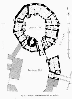 Der eigentlichen Kernburg ist der äußere Schlosshof mit Kanzleigebäude und Dienerwohnungen aus dem 18. Jahrhundert vorgelagert. Der Zugang zur eigentlichen Burg erfolgt durch den inneren Torbau, auch Ludwigsbau genannt.