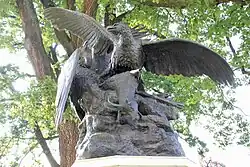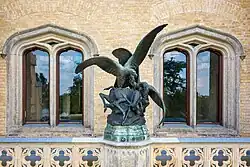 Für das Außengelände von Schloss Babelsberg wurden außerdem Werke des Metzer Tierbildhauers Christophe Fratin erworben. Am nördlichen Rand der Goldenen Terrasse ist die vom Künstler signierte Bronzeplastik Adler und Geier kämpfen um eine Gämse (französischer Originaltitel: Aigle et vautour se disputant un chamois) platziert. Sie entstand 1839 in Fratins Pariser Werkstatt. Auf das Jahr 1851 datiert eine weitere erhaltene Bronzegruppe des Bildhauers. Sie zeigt den Kampf zwischen Adler und Geier um einen Hirsch und befindet sich auf einer Balustrade des Speisesaalbaus.[189]