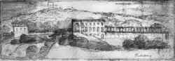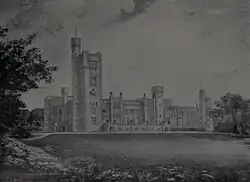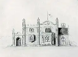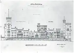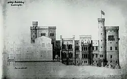 Als möglicher Architekt für den Schlossbau kam der Bauinspektor und ehemalige Schinkelschüler Ludwig Persius in Frage. Ende der 1820er Jahre hatte er während des Umbaus der Schlösser Charlottenhof und Glienicke in Zusammenarbeit mit seinem Lehrmeister Schinkel erstmals eigenständige architektonische Akzente gesetzt.[15] Den Vorstellungen Augustas versuchte Persius in einem Entwurf von 1831 entgegenzukommen. Er schlug eine kubische Bauform mit Spitzbögen und Zinnen vor.[16] Der Entwurf lehnte sich an die italienische Burgenarchitektur des Mittelalters an.[17]