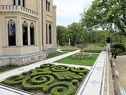 Für die Schlossterrassen trug der Fürst und Gartenkünstler Hermann von Pückler-Muskau die Verantwortung.[58] Als Tochter des Großherzogs von Sachsen-Weimar-Eisenach kannte Augusta den Fürsten bereits vom Weimarer Hof. Pückler hatte dort in der Funktion eines Adjutanten ihrem Großvater gedient.[59] Er war der neue Gartenkünstler, der Peter Joseph Lenné im Park Babelsberg ablöste. Pückler fand keinen Gefallen an der bis dahin das Schloss umgebenden kleiner dimensionierten Terrasse mit Rasenböschung. An ihrer Stelle ließ er bis 1844 vier große Terrassen anlegen. Die Anlagen wurden mit Mauern abgestützt und umfangreich mit Blumen und Plastiken verziert.[60]