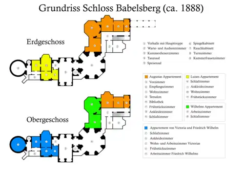 Türmchenförmige Pfeiler grenzen den Wohnbau an seiner Nordseite in drei Bereiche ein. Von Osten nach Westen vergrößert sich dabei jeweils die Breite. Das dritte Segment ist an der Nordseite durch einen Erker hervorgehoben.[141] Wilhelm und Augusta ließen die Innenräume mit einer Vielzahl an Erinnerungsgegenständen und historisierenden Möbeln ausstatten. In dieser Hinsicht nahm Schloss Babelsberg eine großbürgerliche Wohn- und Salonkultur vorweg.[142] Die Wohnung Augustas verteilte sich auf das Ober- und Erdgeschoss. Im Erdgeschoss lagen ihr Vor-, Empfangs- und Wohnzimmer sowie der Teesalon und ihre Bibliothek. Im Obergeschoss nutzte Augusta ein Frühstücks-, Ankleide- und Schlafzimmer.[143]