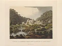 Das Schloss lässt sich der Burgenromantik und Mittelalterbegeisterung des 19. Jahrhunderts zuordnen.[125] Als Vorbild dienten meist nicht „echte“ Bauwerke aus dem Mittelalter, sondern zeitgenössische englische Landsitze, die den früheren gotischen Tudorstil nachahmten. Durch Kupferstiche wurden diese adligen Anwesen auch in Kontinentaleuropa bekannt. So ließ sich Schinkel maßgeblich von dem ab 1824 umgestalteten Windsor Castle inspirieren.[126] Babelsberg spielte in dieser Hinsicht eine besondere Rolle, denn anschließend entstand in Kontinentaleuropa eine Reihe stilistisch ähnlicher Residenzen, die sich an Windsor Castle anlehnen. Dazu zählen unter anderem Schloss Hohenschwangau bei Füssen, Schloss Pierrefonds bei Compiègne und Schloss Marienburg bei Hildesheim.[127] Nach Meinung von Gottfried Riemann stellt Schloss Babelsberg zusammen mit Schloss Hohenschwangau für die neogotische Architektur in Deutschland eine Zäsur dar. Zwar bauten deutsche Landesherren bereits Ende des 18. Jahrhunderts, etwa im Wörlitzer Park, in diesem Stil. Die neogotischen Gebäude blieben jedoch meist noch bloßes Zierwerk und hatten keinen „unmittelbaren Nutzcharakter“. Erst mit Schloss Babelsberg sei die Schwelle hin zu neogotischen Wohnbauten erreicht worden.[128] Babelsberg weist typische Elemente der Romantik und Neogotik auf, etwa die unregelmäßige Höhe der Türme, Erker und Zinnen. Englisch inspiriert sind insbesondere die alle Bauteile umlaufende Zinnenbekrönung, der unregelmäßige Grundriss und die rechteckigen zwei- oder dreiteilig gegliederten Fensterrahmungen.[129] Viele Anregungen könnte Schinkel dem von Humphry Repton verfassten Architekturmusterbuch Fragments on the theory and practice of landscape gardening entnommen haben. Der Bauforscher Manfred Klinkott vermutet, dass Augusta ihm dieses Werk empfahl.[130] Von Bedeutung für Schloss Babelsberg ist vor allem eine architektonische Idealdarstellung nach Seite 20. Das Blatt mit dem Untertitel A design to exemplify irregularity of outline in castle Gothic (Ein Entwurf zur Veranschaulichung der Unregelmäßigkeit des Umrisses in der Burggotik) wirbt im Unterschied zu Windsor Castle für ein asymmetrisches Modell, das Schinkel aufgriff.[131] Als weitere mögliche Vorbilder gelten Eastnor Castle, Gwrych Castle und East Cowes Castle.[132]