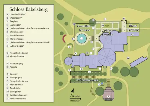 - ↑ Heidrun Liepe, Roland Handrick: Park und Schloss Babelsberg (Amtlicher Führer der Stiftung Preußische Schlösser und Gärten Berlin-Brandenburg) 3. Auflage, Potsdam 1999, S. 28.