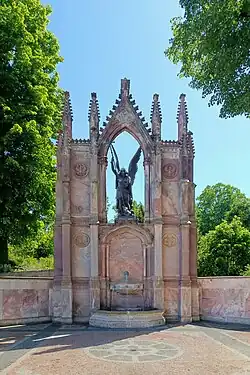 Südlich der Voltaireterrasse steht das Michaelsdenkmal. Mit dem Bau des Monumentes im Jahr 1853 wollte der preußische König Friedrich Wilhelm IV. an den Sieg über die Revolution von 1848/1849 erinnern. Damals hatten preußische Truppen unter dem Oberbefehl von Prinz Wilhelm den Aufstand der Revolutionäre im Großherzogtum Baden niedergeschlagen. Bereits 1850 hatte der Monarch die Initiative zur Aufstellung der Invalidensäule in Berlin zum Gedenken an die in den Revolutionsjahren und im Krieg mit Dänemark gefallenen preußischen Soldaten unterstützt. Da er selbst einen großen Anteil an der Gestaltung der Potsdamer Parkanlagen hatte, gab er als Äquivalent zu dem Berliner Bauwerk im Park Babelsberg ein Denkmal in Auftrag.[192] Es stellt den Erzengel Michael dar. Das himmlische Wesen ist gerade im Begriff, den Lindwurm der Revolution zu bezwingen. Das Denkmal stellt damit eine Analogie zum Schlossherrn her: So wie der Erzengel Michael nach christlichem Glauben den Teufel aus dem Himmel bannte, habe auch Wilhelm mit seinem Kampf gegen die Revolution über „gottfeindliche Mächte“ triumphiert.[193]