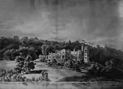 - Im Sommer 1858 besuchte die britische Königin Victoria ihre mit dem späteren preußischen Kronprinzen verheiratete gleichnamige Tochter in Schloss Babelsberg.[64] Das Prinzenpaar sollte ursprünglich das Neue Palais als Sommerresidenz beziehen, konnte aber wegen noch laufender Renovierungsarbeiten vorerst nur in Schloss Babelsberg Quartier nehmen.[65] Deshalb war Wilhelms Hofverwaltung für die Aufnahme und Versorgung der königlichen Gäste verantwortlich. Da das Schloss für einen solchen Empfang nicht ausgestattet war, mussten Möbel aus anderen Schlössern herbeigeschafft werden. Die britische Königin und ihr Gemahl blieben 14 Tage in Babelsberg. In dieser Zeit wurden auch Ausflüge in die nähere Umgebung unternommen, etwa Bootsfahrten auf der Havel und Besichtigungen berühmter Bauwerke.[66] Stefan Gehlen nimmt an, dass es neben den zahlreichen Zerstreuungen aber auch politische Unterredungen gab. So könnte sich Albert von Sachsen-Coburg und Gotha, der Gemahl Victorias, von einem Bündnis zwischen Preußen und Großbritannien Vorteile für seine eigene Dynastie erhofft haben: Im Falle einer von Preußen durchgesetzten Nationalstaatsgründung sollte der Verbündete dazu bewegt werden, von einer Auflösung der deutschen Kleinstaaten abzusehen.[67] Während ihres Besuches fertigten die britische Königin und ihre Tochter Skizzen an, die den Ausblick vom Schloss auf die Landschaft zeigen. Die Ansichten sind bis heute erhalten und Teil der Royal Collection.[68]