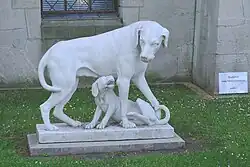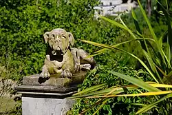 Auf der Porzellanterrasse standen ursprünglich viele Tierplastiken. Den Zweiten Weltkrieg überdauerten davon unter anderem drei steinerne Hundefiguren: die Darstellung einer Bulldogge, eines Neufundländers und einer Ulmer Dogge.[184] Erstere steht am nordwestlichen Rand der Terrasse und wird der deutsch-amerikanischen Bildhauerin Elisabet Ney zugeschrieben. Deren Urheberschaft ist jedoch nicht sicher, da die Inventarakten des Schlosses die Skulptur nicht erwähnen.[185] Die Künstlerzuordnung beruht ausschließlich auf der Beobachtung, dass ein im texanischen Elisabet Ney Museum ausgestelltes Gipsmodell der Steinplastik stark ähnelt und möglicherweise als Vorlage diente. Nach Einschätzung der Kunsthistorikerin Dagmar von Stetten-Jelling könnte Ney die Skulptur 1896 bei einer Deutschlandreise verkauft haben. Die „Bulldogge“ wurde nach dem damals neuartigen Steingussverfahren angefertigt.[186] Die Darstellung ist nach Meinung der Kunsthistorikern Sibylle Einholz Tyras, dem Hund von Neys Vater, nachempfunden.[187] Die Stiftung Preußische Schlösser und Gärten schreibt auch die anderen Hundeskulpturen Ney zu.[188]