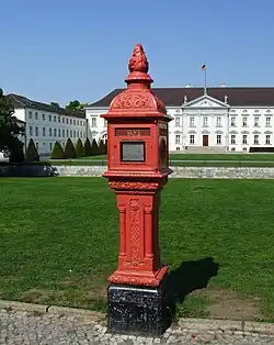 - Vor dem Schloss Bellevue befindet sich ein oft fotografierter, historischer roter Feuermelder.[31]