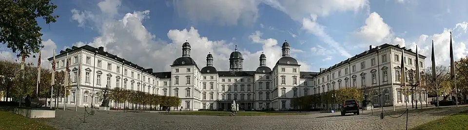Johann Wilhelm II. beauftragte 1703 den Grafen Matteo d’Alberti mit dem Bau eines neuen Schlosses im Barockstil. Es war als Jagdschloss für seine zweite Frau gedacht und orientierte sich stilistisch an Schloss Versailles und das Entwurf von Christopher Wren für Winchester Castle.[1] Die Mittelachse des Gebäudekomplexes ist exakt auf den Kölner Dom ausgerichtet, der 14 Kilometer Luftlinie entfernt liegt. Johann Georg Jacobi schreibt in seinem Tagebuch: