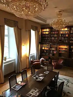 Die Bibliothek umfasst auf 55 m² (4,55 m × 5,60 m) eine Sammlung mit ca. 5.000 antiquarischen Büchern.[10] Bemerkenswert ist überdies der Zanetti-Saal mit dem Deckenfresko 'Sturz der Titanen' von Domenico Zanetti.[11]