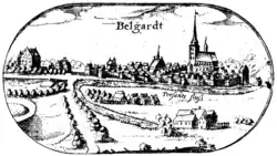 | Die alte Lubinsche Karte zeigt in der Darstellung ganz links, das Schloss in Belgard, das nach dem Dreißigjährigen Krieg immer weiter verfiel. |