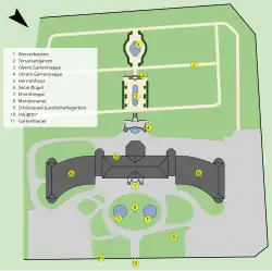 Innerhalb des Schlossareals steigt das Gelände von der Straßenseite kommend gleichmäßig an. Der vordere, niedriger gelegene Teil wird durch den als Landschaftsgarten gestalteten Schlosspark eingenommen. Seine Ausmaße betragen aber nur ein Bruchteil seiner früheren Größe. Heute nimmt er den Bereich vor dem Schloss und an dessen Seiten ein. Früher erstreckte er sich auch auf ein großes Gebiet südöstlich des Schlosses. Dieser Bereich ist heute größtenteils ein öffentlicher Park und zu einem geringen Teil modern überbaut. Der Landschaftsgarten auf der Vorderseite wurde im 19. Jahrhundert angelegt. Aus jener Zeit stammen – neben den beiden runden Wasserbassins mit Fontänen – noch einige Baumgruppen und Solitärbäume wie alte Buchen, Ahorne und Kastanien.[12] Zwischen den Wasserbecken steht eine Marienstatue aus der zweiten Hälfte des 19. Jahrhunderts[15] und erinnert an die Zeit der Anlage als Kloster. Sie ruht auf einem hohen quadratischen Sockel aus Sandstein und wurde dort durch die Klosterschwestern aufgestellt.[15]