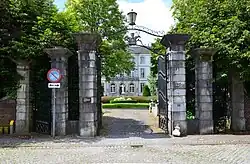 Der Zugang erfolgt durch eine Toranlage aus dem späten 18. Jahrhundert[11] in der Mitte der Nordost-Seite, auf die eine mit Ulmen bepflanzte geradlinige Allee zuführt. Ihr großes Mitteltor aus Schmiedeeisen wird von zwei Pfeilern aus Namurer Blaustein flankiert. Früher wurden diese Pfeiler von Vasen bekrönt. Zu beiden Seiten finden sich schmale Nebentore, die vermutlich erst um 1850 dort installiert wurden.[11] Das große Mitteltor besitzt zwei schmiedeeiserne Aufsätze in Bogenform. Während der obere in der Mitte eine Laterne trägt, ist der untere von kleinen Dreizacken besetzt und zeigt mittig das Emblems des Ordens vom Heiligen Herzen Jesu.