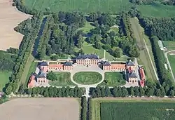 Das Schloss steht auf einer rechteckigen Insel, die nach niederländischem Vorbild von einer Graft umgeben ist. Die Grabenanlage hatte nicht nur ästhetische Gründe, denn das Schlossgelände befindet sich in einer Niederungszone, und die Graft diente der Entwässerung des feuchten Gebiets.[48] Der Aushub wurde zudem benötigt, um die Inselfläche aufzufüllen und zu ebnen. Die Insel ist 345 Meter lang und 205 Meter breit. Auf Höhe des Ehrenhofs sind die Gräben etwas schmaler, sodass die Insel dort eine Breite von 220 Metern erreicht. Die Gesamtfläche der Schlossinsel beträgt gut 7 Hektar, wovon Schloss und Ehrenhof ungefähr das südliche Viertel einnehmen. Das Randgebiet der Insel war ebenso wie die äußeren Ufer der Graft ursprünglich durch Lindenalleen gegliedert, die im Laufe der Jahrhunderte aber zum Teil für Feuerholz gefällt wurden, insbesondere nach dem Zweiten Weltkrieg. Die für den Parkbereich zuständige Gärtnerei befand sich südlich außerhalb der Schlossinsel. Dort wurde auch ein Obstgarten angelegt, der in Grundzügen noch existiert.[49]