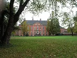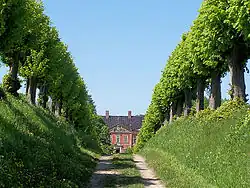 Der Schlossgarten wurde zeitgleich mit dem Schloss angelegt, doch ist sein ursprüngliches Aussehen nicht bekannt.[50] Aus dem 18. Jahrhundert existieren lediglich wenige und zudem widersprüchliche Skizzen, bei denen nicht sicher ist, ob sie eine geplante Gestaltung oder die Umsetzung darstellen. Der Garten wird als typischer Barockgarten niederländischer Prägung gestaltet gewesen sein. Die Pläne lassen einen dreigeteilten Aufbau mit zwei äußeren Broderieparterres und einem mittleren Rasen- oder Wasserparterre vor dem Corps de Logis ebenso möglich erscheinen[51] wie einen der heutigen Struktur ähnlichen Gartenbereich, in dem seitliche Boskette ein mittleres Parterre mit halbrundem Abschluss rahmten.[52] Ein Teil der Pflanzen wurde 1731 beim Konkurs des Guts Sierhagen in Schleswig-Holstein erworben.[50] Der Garten hatte Sichtachsen auf die natürliche hügelige Umgebung als Vorwegnahme der Gartentheorie der zweiten Hälfte des 18. Jahrhunderts.[53] Der Schlossgarten wurde im Laufe des 19. Jahrhunderts in einen Landschaftsgarten umgewandelt, wobei seine durch Alleen gegliederte Grundstruktur weitgehend erhalten blieb. In die Mitte des Parterres wurde zu dieser Zeit ein nierenförmiger Teich eingelassen, außerdem wurden exotische Solitärbäume sowie Rhododendren und Azaleengruppen gepflanzt.