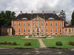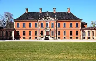 Das Corps de Logis enthielt die Wohn- und Repräsentationsräume der gräflichen Familie. Über die hofseitige Freitreppe betritt man ein Vestibül, das mit dem dahinterliegenden Weißen Saal verbunden ist. Das Vestibül ist mit stuckierten Reliefs des ersten Schlossbewohners und seiner Frau geschmückt, der Weiße Saal diente als Gartensalon und ist durch eine nördlich gelegene Freitreppe mit dem Park verbunden. Auf ein zentrales Treppenhaus – zur Barockzeit durchaus üblich – wurde im Corps de Logis verzichtet, die große Hauptstiege befindet sich rechts der Eingangshalle. Der bedeutendste und zugleich größte Raum des Gebäudes ist der mit dunklen Vertäfelungen ausgestattete Festsaal im Obergeschoss, der aufgrund der früher dort präsentierten Gemälde auch als Ahnensaal bezeichnet wurde. Als wichtigster Saal des Schlosses übernahm er repräsentative Aufgaben, diente aber zugleich durch seine zentrale Lage zur Verbindung der Appartements miteinander. Der Ahnensaal blieb verhältnismäßig gut erhalten, der Deckenstuck wurde bereits in den Jahren 1996 bis 1997 restauriert.[36] Als kunsthandwerklich herausragend gilt das sogenannte Intarsienkabinett an der westlichen Hofseite.[37] Die frühere Nutzung der Wohnräume des Corps de Logis kann heute nicht mehr genau festgestellt werden, da sie nach den Bedürfnissen der Bewohner im Laufe der Generationen verschiedene Zwecke erfüllten.[38] Sie dienten über einen Zeitraum von mehr als zweihundert Jahren als Salons, Schlafräume, Arbeits- und Empfangszimmer und waren, wie Fotos des 19. und frühen 20. Jahrhunderts belegen, umfangreich und wohnlich mit Möbeln, Gemälden und Kunstgegenständen ausgestattet.[39]