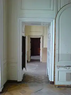 Um Platz für die Bewohner des Altenheims zu schaffen, erhielten zwei der eingeschossigen Verbindungsbauten durch eingezogene Zwischendecken ein zusätzliches Stockwerk, die hohen Fenster wurden geteilt. Die einstigen Wirtschaftsräume wurden so völlig zerstört.[46] Das östliche Verbindungshaus und die Reithalle nahmen die Pflegestation des Heims auf, was ebenfalls einen völligen Umbau erforderte.[47] Weiterhin wurden in einigen der Salons des Hauptgebäudes Waschgelegenheiten eingebaut, die zu Feuchtigkeitsschäden an den Täfelungen führten. Die Wände der Innenräume wurden mehrfach übertapeziert, Türrahmen und Kamine mit Ölfarbe gestrichen und die Dielenfußböden mit Linoleum belegt, was zum Teil die Bildung von Schimmel zur Folge hatte. Bauschäden aus der Altenheimzeit wurden zumeist nur provisorisch behoben, sodass sich das Schloss 1994 in einem stark sanierungsbedürftigen Zustand befand. Weiterer Verfall erfolgte in den nächsten zehn Jahren des Leerstands, obwohl in einer ersten Sicherungsmaßnahme von 1996 bis 1997 der Dachstuhl des Corps de Logis vom Hausschwamm befreit und die Decke des Festsaals restauriert worden war.[37] Trotz der jahrzehntelangen Vernachlässigung des Gebäudes sind zahlreiche Details der barocken Ausstattung erhalten geblieben.
