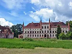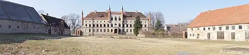 Das siebzehnachsige, zweieinhalbgeschossige, ungewöhnlich groß dimensionierte Herrenhaus mit Walmdach besitzt einen umlaufenden Zinnenkranz. Am dreigeschossigen Mittelrisalit wie auch an den Ecken des Gebäudes sind schlanke fialartige Backsteintürmchen angesetzt. Vom Wirtschaftshof sind sechs Gebäude erhalten, darunter der Marstall mit Reithalle.