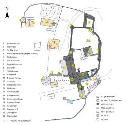Die Kernburg ist an ihrer Angriffsseite im Osten durch eine 17 Meter[95] breite, mehrgeschossige Schildmauer geschützt, vor der ein 14,5 Meter[96] breiter und 6,2 Meter[96] tiefer Burggraben lag. Vor ihrem Wiederaufbau war von der Schildmauer nur noch ein 2,70 Meter hoher Rest übrig.[97] Ihr schließt sich nördlich und südlich die Ringmauer der Kernburg an, die innere Ringmauer genannt wird. Sie stammte ursprünglich von der ersten Bauphase der Burg im 12. Jahrhundert, wurde aber zwischen 1888 und 1902 neu aufgemauert,[93] sodass von der Originalsubstanz nur geringe Reste in den heutigen Fundamenten vorhanden sind. Beim Wiederaufbau ließ der Schlossbauverein sie mit einem umlaufenden, im Westen und Nordosten nach außen vorkragenden Wehrgang ausstatten. Im Norden besitzt die innere Ringmauer eine Dicke von 1,65 Metern, an der Südostseite ist sie 1,8 Meter dick.[98] An der Ostseite findet sich außen ein Aborterker, der als Heymlich Gemach bezeichnet wird. Die Nordwestecke der inneren Ringmauer wird durch den achteckigen Diebsturm markiert. Er trägt seinen Namen, weil er bis in das 19. Jahrhundert als Gefängnis für Diebe und sonstige Verurteilte gedient haben soll.[99] Der Turm besitzt im mittelalterlichen Erdgeschoss ein Kuppelgewölbe, während seine beiden Obergeschosse aus dem 15. Jahrhundert mit flachen Balkendecken ausgestattet sind.[98] Als Dach besitzt er einen achtseitigen Helm. Der durch innere Ringmauer und Randbebauung gebildete Burghof ist durch eine Mauer mit Gittertor in einen nördlichen und einen südlichen Teil getrennt. Im Nordteil befindet sich der über 30 Meter[100] tiefe Burgbrunnen.