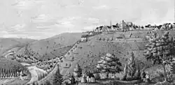 Hinter dem Zwingertor erreicht der Besucher den Bereich der ehemaligen Burgfreiheit, die früher von einer äußeren Ringmauer aus dem 13. Jahrhundert eingefasst war. Zur Burgfreiheit gehört neben neuzeitlicher Bebauung auch das Johannitertor, dessen unterer Teil noch auf das Mittelalter zurückgeht.[82] Den Namen erhielt der Bau von seinen ehemaligen Bewohnern, denn er war früher Teil der Johanniterkommende. Ab 1800 gehörte er allerdings zur Wohnung des Pfarrers der benachbarten Kirche St. Martinus,[83] die früher die Kirche der Johanniter gewesen ist. Im ehemaligen Pfarrgarten neben der Bergstation der Seilbahn steht eine etwa 250 Jahre alte Winterlinde (Tilia × europaea „Pallida“), die Kaiserlinde genannt wird.[84] Sie ist eines von insgesamt sieben Naturdenkmälern auf dem Burgareal. Neben vier weiteren Linden stehen auch eine Blutbuche und eine Rosskastanie unter Naturschutz.[85]