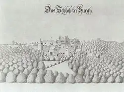 Während des Dreißigjährigen Kriegs belagerten im Herbst 1632 schwedische Truppen unter General Baudissin die Anlage, als sie eine kaiserliche Besatzung hatte. Die Schweden konnten Schloss Burg aber nicht erobern. Dennoch wurde es durch Brandsätze und Geschützkugeln schwer beschädigt.[26] Als im Februar 1641 der kaiserliche Oberst Otto Christoph von Sparr Schloss Burg angriff und einnehmen konnte, war es von hessischen Truppen besetzt.[27] Nach dem Friedensschluss 1648 schleiften die Kaiserlichen unter ihrem Kommandanten Heinrich von Plettenberg vor ihrem Abzug große Teile der Anlage. Dabei wurden nicht nur die wehrhaften Teile wie Bergfried, Geschützturm, befestigte Tore und Mauern niedergelegt, sondern nach einem Bericht aus dem Jahr 1692[28] auch „Pferdestall, Backhauß und Brauhauß, also daß nichts mehr unter Dach stehet als das hohe Gebew“.[29] Sogar die Johanniterkirche wurde zerstört.[30] Außer dem Diebsturm und einigen Wirtschaftsgebäuden stand am Ende des 17. Jahrhunderts nur noch der notdürftig wiederhergestellte Palas, der weiterhin als Kellnerei diente. Auf einer Ansicht des Schlosses, die der Kartograf Erich Philipp Ploennies im Jahr 1715 anfertigte, ist die Anlage bereits ohne Bergfried und äußere Ringmauer dargestellt. Die auf der Zeichnung zu sehenden Fachwerkaufbauten wurden bis spätestens 1729 entfernt.[31]