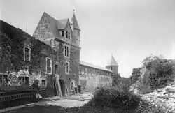1887 waren von der ehemals großen Burganlage nur noch einige Außenmauern des Palas, ein ruinöses inneres Torhaus, Teile der Schildmauer sowie der Diebsturm und eine daran anschließende Mauer erhalten.[31] Unterdessen wurden in der Bevölkerung Stimmen laut, die sich für den Erhalt der verbliebenen Reste einsetzten. Im Dezember 1886 traf sich unter der Federführung des Wermelskirchener Fabrikanten Julius Schumacher ein erstes „Komitee zur Erhaltung der Schloßruine zu Burg an der Wupper“, dem am 3. August 1887 die Gründung des „Vereins zur Erhaltung der Schloßruine zu Burg a. d. Wupper“ (ab 1897 „Schloßbauverein Burg an der Wupper“) folgte.[39][40] Der hatte anfangs lediglich die Sicherung der Burgruine zum Ziel und wurde dabei vom Bergischen Geschichtsverein unterstützt. Schon bald trat jedoch das Ziel eines Wiederaufbaus in den Vordergrund, denn der aus Barmen stammende Architekt Gerhard August Fischer hatte die Gründungsversammlung mit einer Fülle von detaillierten Zeichnungen, Plänen und Entwürfen für eine Rekonstruktion begeistern können.[40] Fischers Wiederaufbaupläne, für die er anfänglich 100.000 Mark veranschlagte,[41] fanden auch beim damaligen Provinzialkonservator Paul Clemen Zuspruch.[42] 1888 wurden erste Entschuttungsarbeiten und Ausgrabungen im Burghof durchgeführt, bei denen unter anderem die unter einem Hügel aus Erde und Schutt verborgenen Bergfriedfundamente wieder freigelegt wurden.[43] Ab 1890 erfolgte dann ein allmählicher Wiederaufbau durch den Schlossbauverein nach Fischers Plänen, die eine Mischung aus Rekonstruktion nach historischen Vorbildern und Grabungsergebnissen sowie phantasievollen Eigenkreationen waren. Schloss Burg sollte als „bergisches Nationaldenkmal“ wiederauferstehen.[44] Die ersten Bauarbeiten begannen am 12. April 1890[45] am inneren Burgtor, dessen Einweihung am 13. August 1890 gefeiert wurde.[46] Anschließend erfolgte die Wiederherstellung der sich nördlich anschließenden Wehrmauer samt Wehrgang. Eine ursprünglich von Fischer angedachte Rekonstruktion des alten romanischen Palas der Anlage erfolgte zwar nie, aber im Frühjahr des Jahres 1891 begann die Rekonstruktion des zweigeschossigen Saalbaus aus dem 13. Jahrhundert. Am 22. August desselben Jahres konnte bereits Richtfest gefeiert werden, und nur drei Monate später fand am 21. Oktober die Einweihungsfeier statt.[47] Im darauffolgenden Jahr erfolgte der Bau des Kapellenflügels mit der neugotischen Burgkapelle. Ihre feierliche Einweihung fand am 10. August 1892 statt.[47] Hatten die Arbeiten 1890 mit 13.290,50 Mark zu Buche geschlagen, kosteten sie 1891 schon 25.490,64 Mark und fanden 1892 mit 46.399,23 Mark ihren vorläufigen Höhepunkt.[48] Das Jahr 1893 brachte der Verein damit zu, die Lücken in der inneren Ringmauer zu schließen und die dicke Schildmauer im Osten wiederaufzubauen, was Kosten in Höhen von 38.730,33 Mark verursachte.[49] Bis zum Sommer 1894[50] wurde die Ecke zwischen dem mittlerweile Palas genannten Saalbau und dem Kapellenflügel geschlossen, sodass sich die Gesamtkosten des Wiederaufbaus bis Ende des Jahres auf rund 200.000 Mark summiert hatten.[49] 135.000 Mark entfielen allein auf den Palas,[49] in dem noch 1894 ein erstes Museum eingerichtet wurde. Anschließend erlahmten die Wiederaufbauarbeiten ein wenig, denn dem Verein war vorläufig das Geld ausgegangen. 1895 konnte noch die Schildmauer samt ihrem Wehrhaus fertiggestellt werden. Gleiches gilt für die der Fantasie Fischers entsprungene Nordterrasse, die der Kernburg von 1892 bis 1895[51] an der Nordseite angefügt wurde. Anschließend ruhten die Bauarbeiten fast vollständig.