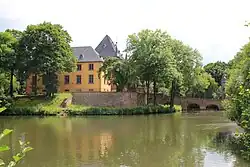 Die frühesten Spuren stammen ungefähr aus dem Jahr 1100. Die Aufbauten befanden sich auf einer Motte (Turmhügelburg). Noch heute steht das Herrenhaus auf einer Insel mit einem Durchmesser von fünfzig Metern.[31] Der Wohnturm stammt ebenfalls aus dem Mittelalter.[32] Danach entstanden der Süd-, Ost- und Nordflügel der Hauptburg. Am Wohnturm befindet sich der 1551 errichtete Erker. Der vier mal 6,6 Meter große und 1,75 Meter tiefe Vorbau ist mit zahlreichen Reliefs geschmückt, die auf eine Hochzeit und antike Literatur verweisen.[33] Im Jahr 1675 entschloss sich Daniel von Elmpt, das beschädigte Schloss renovieren zu lassen.[34] Um 1730 folgte der Umbau zu einer barocken Dreiflügelanlage.[35] 1685 veranlasste Anna Maria Catharina von Elmpt den Bau einer neuen Vorburg.[36] Das dreiflügelige Bauwerk, das ebenso wie die Hauptburg mit einem Wassergraben umgeben ist, diente als Wirtschaftsgebäude. Im nordwestlichen Teil der Vorburg befindet sich heute der Winkelsaal.