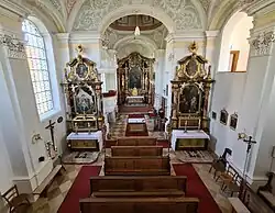 Der Neubau erfolgte bis 1719 durch Dominik Gläsl unter Fürstbischof Johann Franz Eckher von Kapfing und Lichteneck. Das Innere des dreijochigen Langhauses und des stark eingezogenen Chors (zweijochig, halbrunder Abschluss) sind reich mit zartem Rokoko-Stuck geschmückt. Stuckarbeiten erfolgten durch Nikolaus Liechtenfurtner. Das Deckengemälde im Langhaus stellt Maria Immaculata dar. Im rechten Seitenaltarbild (Johann Caspar Sing, 1723) ist zu betrachten, wie die heiliggesprochene Kaiserin Kunigunde bei einem Gottesurteil über glühende Pflugscharen schreitet. Dies soll sich auf Burgrain ereignet haben. Das Bild des die ganze Chorbreite einnehmenden Hochaltars stellt den Hl. Georg hoch zu Ross dar, ebenfalls von J. C. Sing.